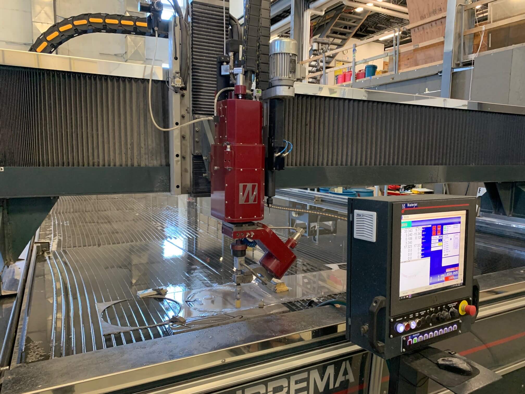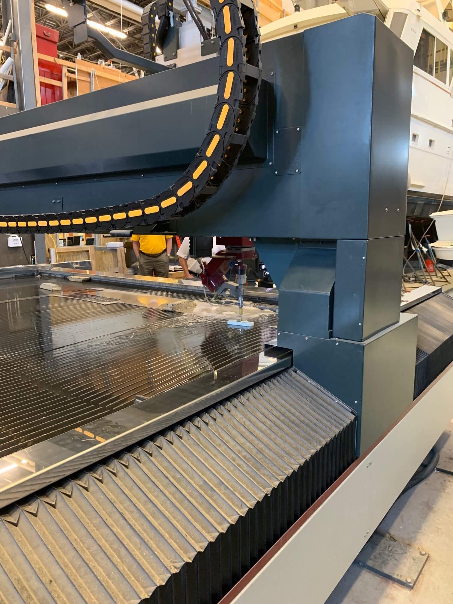 AEC Engineering attended the Manufacturers Association of Maine’s industry tour to Front Street Shipyard to see their new waterjet cutting machine which is the largest in the Northeast. The machine was made by Illinois-based Waterjet USA LLC and is the largest model the company has ever built and installed. The material table size is 41 feet by 13 feet with a 20-inch Z axis. Cutting is done with ultra high-pressure water which can cut marble, granite, glass, ceramic, composite materials, metals, and alloys. According to Front Street Shipyard’s website, “The waterjet cutting process doesn’t produce any mechanical or thermal deformations on the material, nor does it require any additional processing since the contoured surface of the cut is perfectly finished.” Very cool! More info here at their site.