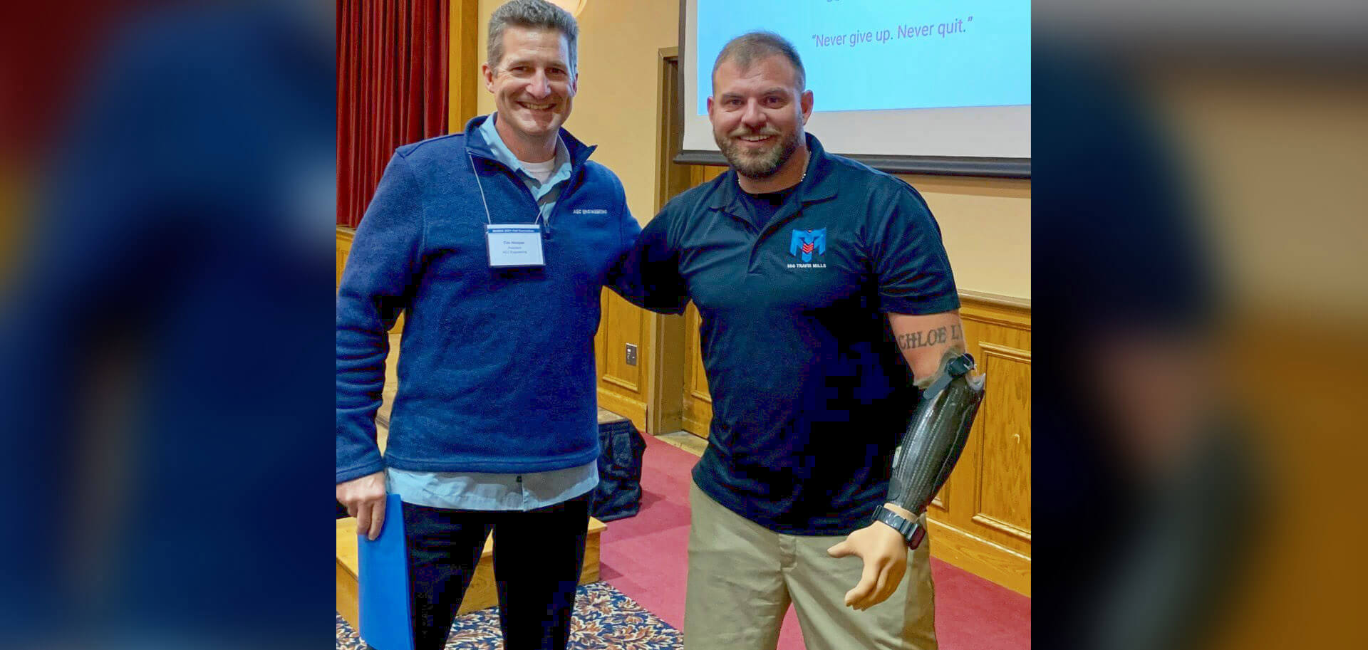 The Maine Water Environment Association (MeWEA) Fall Convention was held September 16–17 at the Sunday River Grand Summit Resort in Bethel, Maine. Keynote speaker was Travis Mills, army veteran, motivational speaker, and one of only 5 servicemen from the wars in Iraq and Afghanistan to survive quadruple amputation. If you’ve never heard Travis speak, we encourage to do so. His self-deprecating humor immediately endears him to the audience and his story of success, devastating injury, recovery, and then success once again, is amazing. It will change your perspective and make you think twice if you’re ever having a bad day. In the 10+ years since his injury, Travis has accomplished some amazing things. During his speech he also announced that his Foundation has just broken ground on a multimillion dollar health & wellness center for veterans. Please check out his website to learn more about this inspirational person, and consider contributing. The foundation is supported by private and corporate donations.